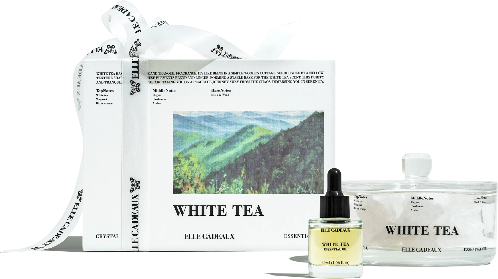 The packaging is stunning - box feels premium with sturdy build and magnetic closure. Glass jar is thick, high quality. Crystals are gorgeous with natural shimmer. White tea oil is heavenly - crisp, clean, citrusy. Perfect for gifting.